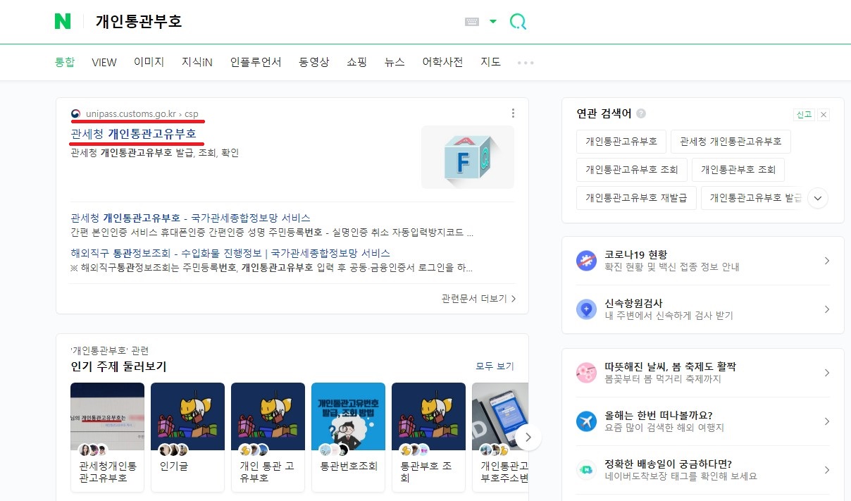 1) 검색창에 개인통관부호, 통관부호, 통관번호등으로 검색하시고 관세청 개인통관고유부호를 클릭해주세요.