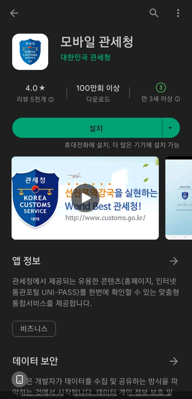 1) 먼저 구글플레이스토어 또는 앱스토어에서 모바일 관세청을 설치해 주세요.