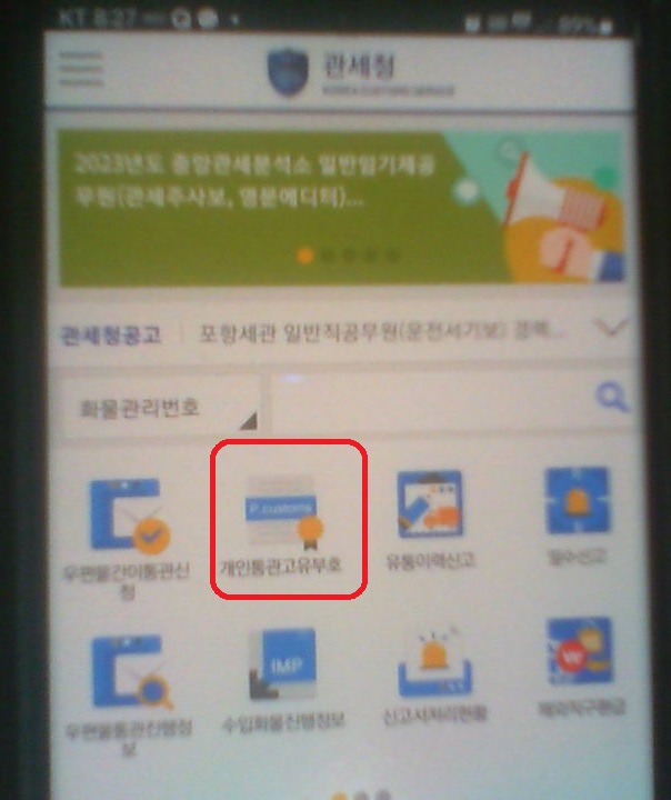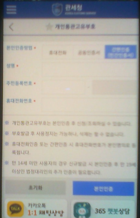 2) 앱을 실행하시면 중간정도에 개인통관고유부호를 클릭해 주세요. (안드로이드 기준)