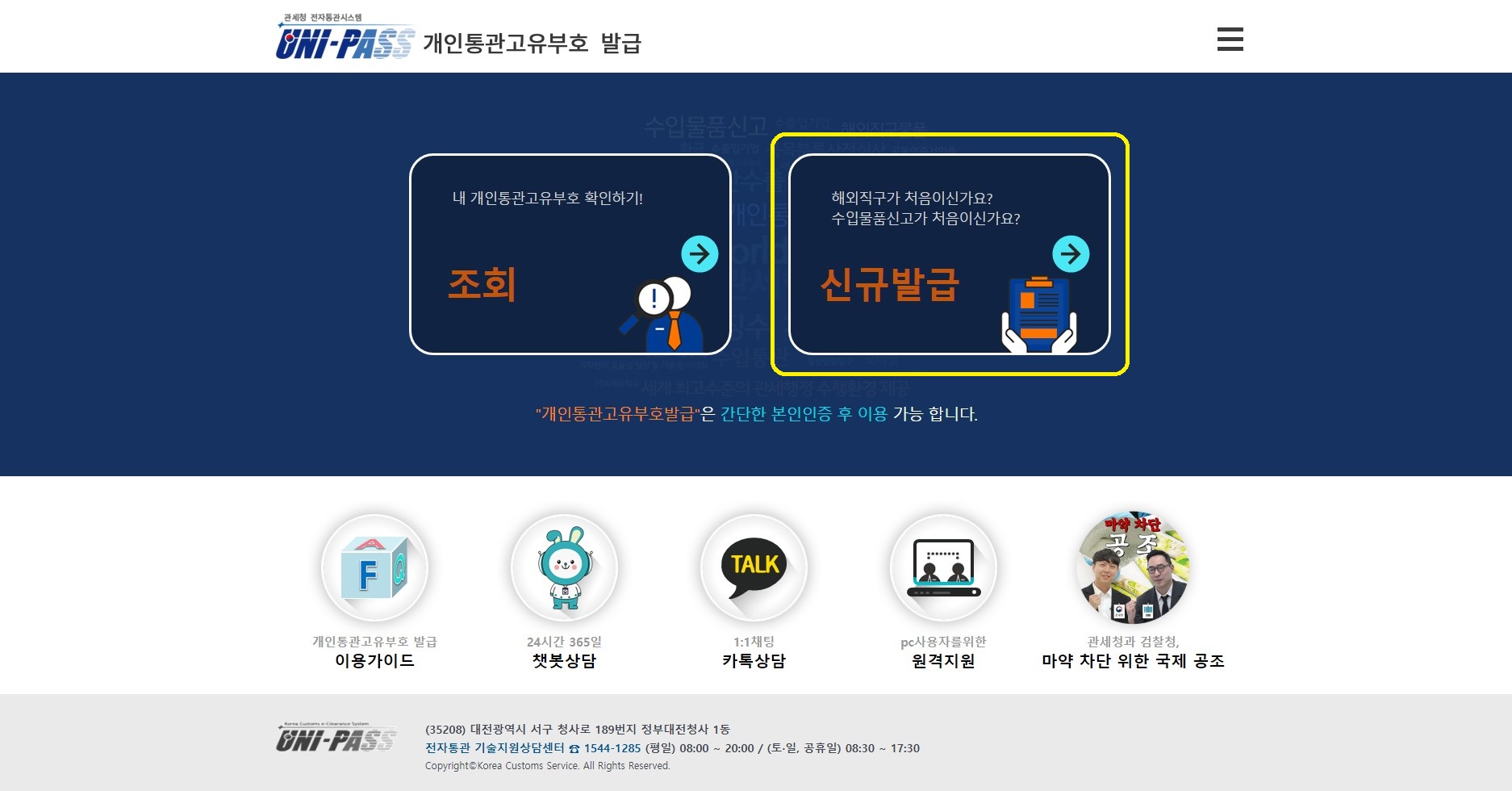 2) 신규발급을 클릭합니다. 이미 발급 받으신 분들은 조회를 클릭하셔서 본인인증을 하시면 발급받은 개인통관고유부호를