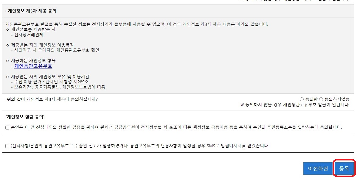 5) 정보를 모두 적으셨다면 아래 개인정보 수집 이용 동의를 모두 동의해 주세요. 그리고 개인정보 열람 동의도 체크해 주세요. 그리고 우측아래 등록을 클릭하시면 개인통관고유부호 발급이(가) 정상적으로 완료되었습니다 라는 팝업이 나오며 발급이 완료됩니다.